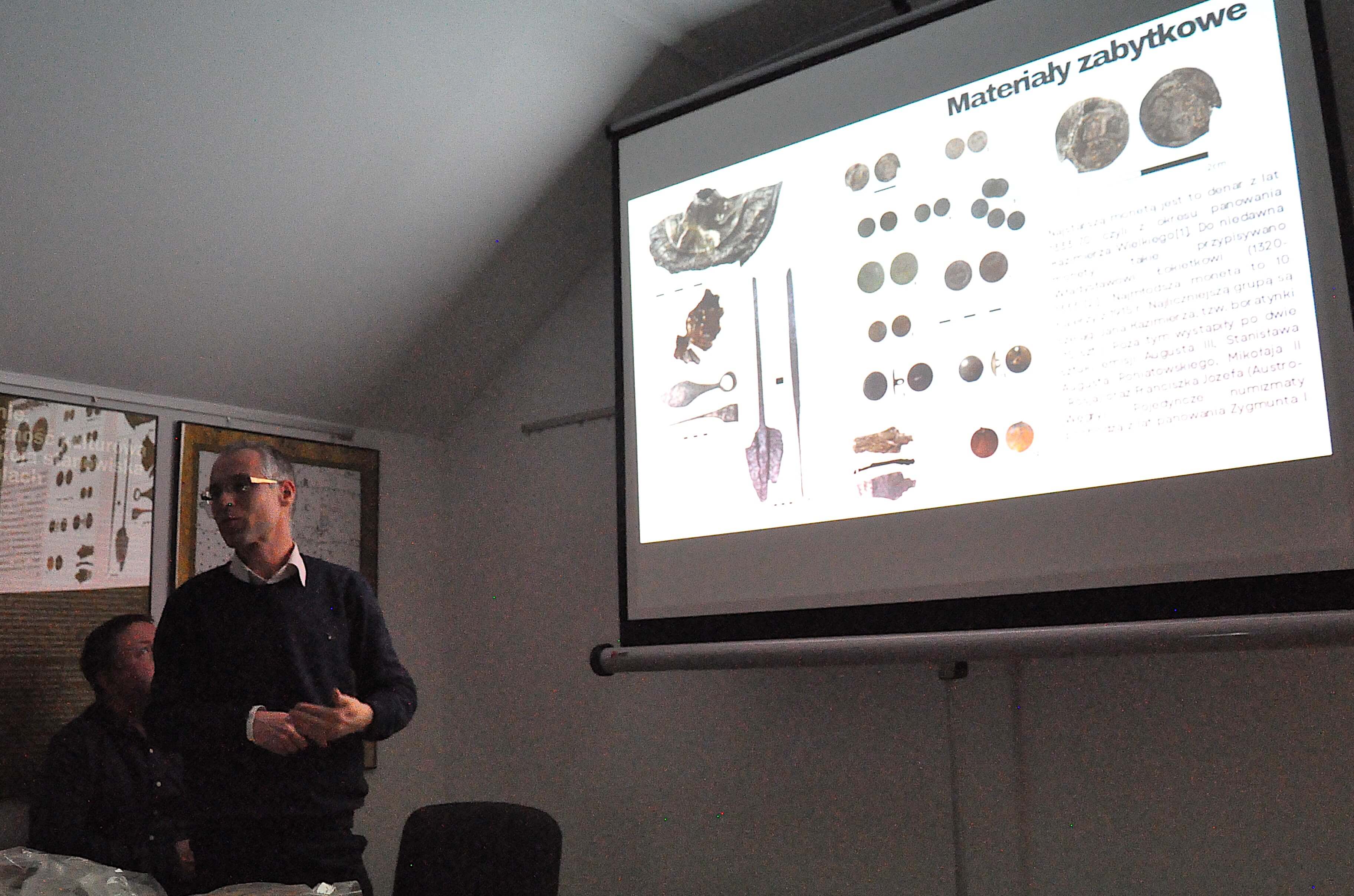 Uczestnicy spotkania mogli zobaczyć zabytki ruchome odkryte w czasie badań sondażowych, w tym wspomniane wyżej narzędzia rolnicze, fragmenty ceramiki, XVII-wieczne kafle piecowe oraz kolekcję monet, wśród których najstarszą był denar Kazimierza Wielkiego.